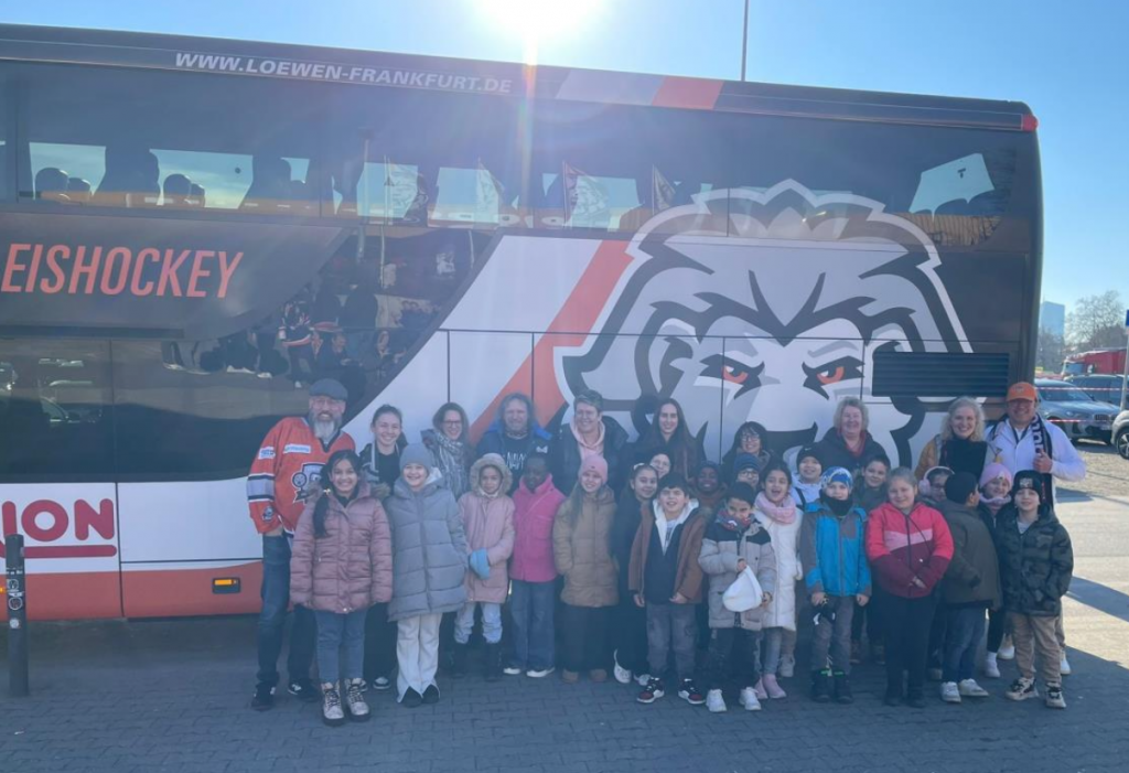 Am Sonntag war es dann soweit: Bei strahlendem Sonnenschein wurden die Gewinner vom Profi-Bus der Frankfurter Löwen und dem Team-Fahrer Uwe F. direkt an der Schule abgeholt. Wie die Profis wurden die Schülerinnen und Schüler, Lehrkräfte und Begleitpersonen bis direkt vor den Eingang des Stadions gebracht. Dort gab es für alle erstmal einen Löwen-Fan-Schal; dass dieser sechsmal zum Einsatz kommen sollte, wusste natürlich noch niemand
